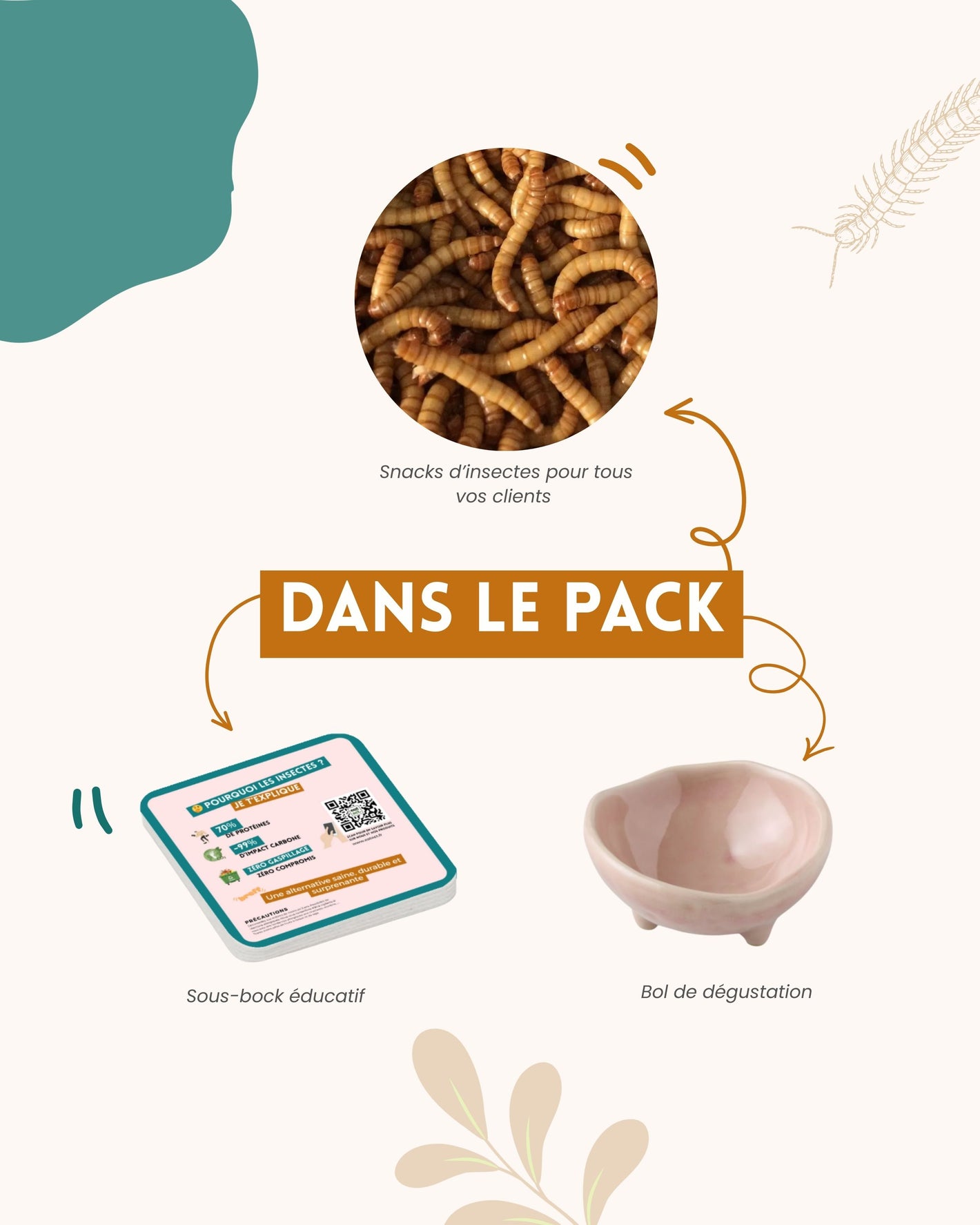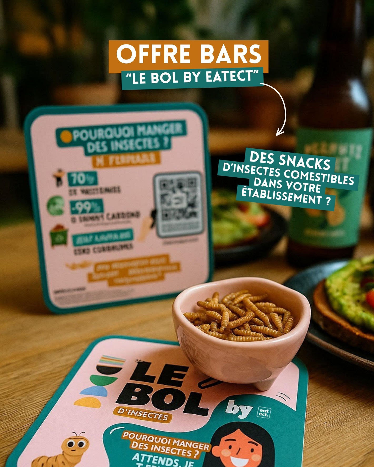 Le concept repose sur la mise à disposition de snacks à base d’insectes comestibles, servis dans de petits bols de dégustation et accompagnés de sous-bocks éducatifs. L’ensemble est fourni par EatEct et pensé pour être installé immédiatement, sans modifier l’organisation de votre établissement. -